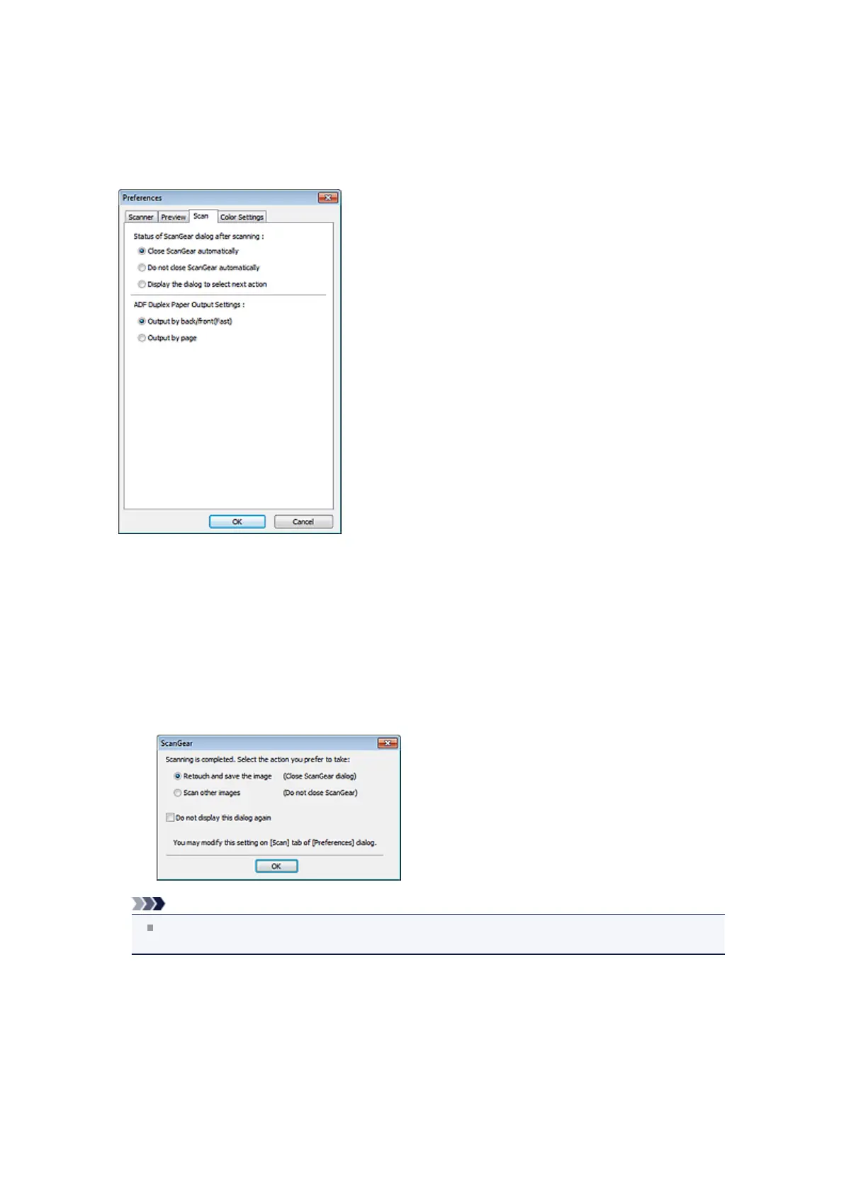 Even if Do not close ScanGear automatically or Display the dialog to select next action is set,