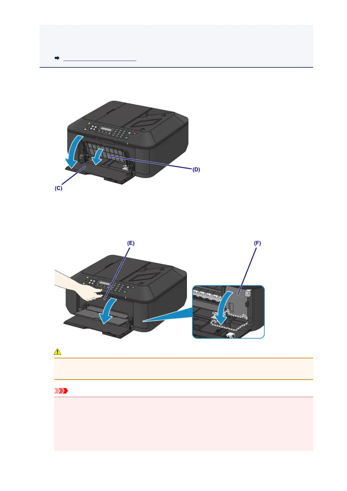 1. Make sure that the power is turned on, open the front cover (C), then open the paper