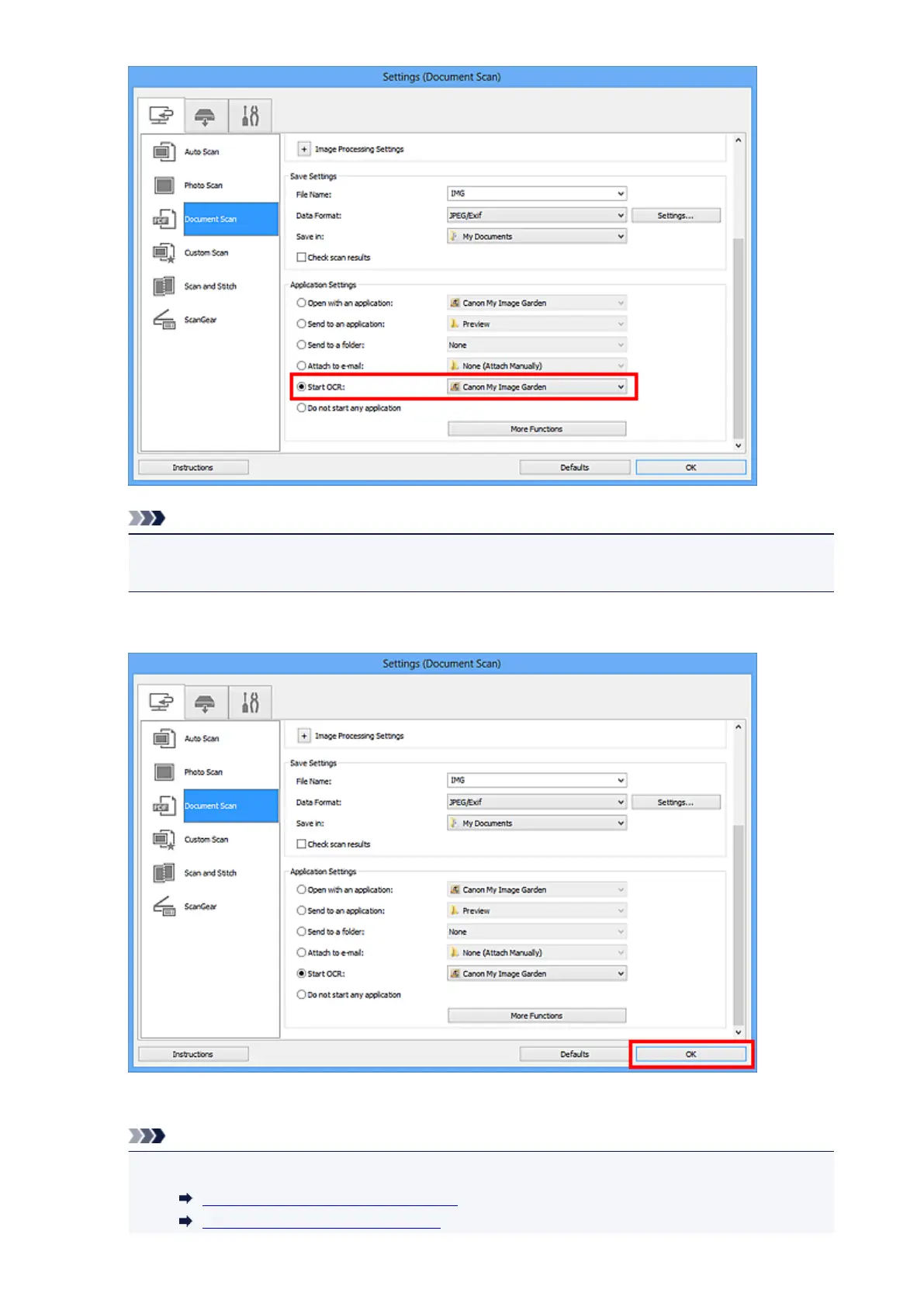 • When My Image Garden is specified, after the image is scanned, the text in the image is extracted