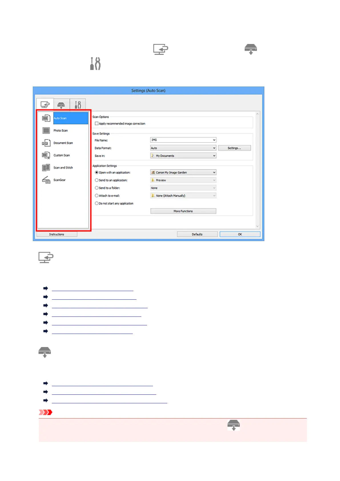 • When the Settings dialog box is displayed from My Image Garden, the (Scanning from the