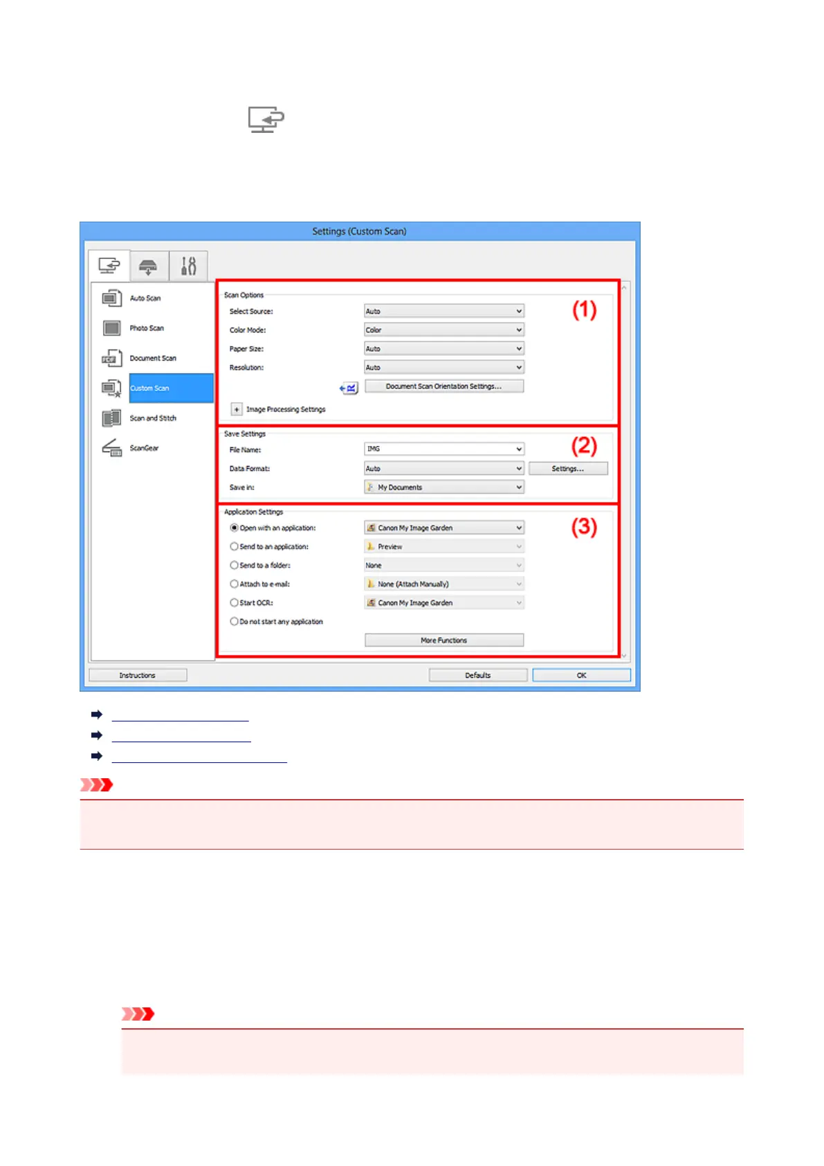 Click Custom Scan on the (Scanning from a Computer) tab to display the Settings (Custom Scan)