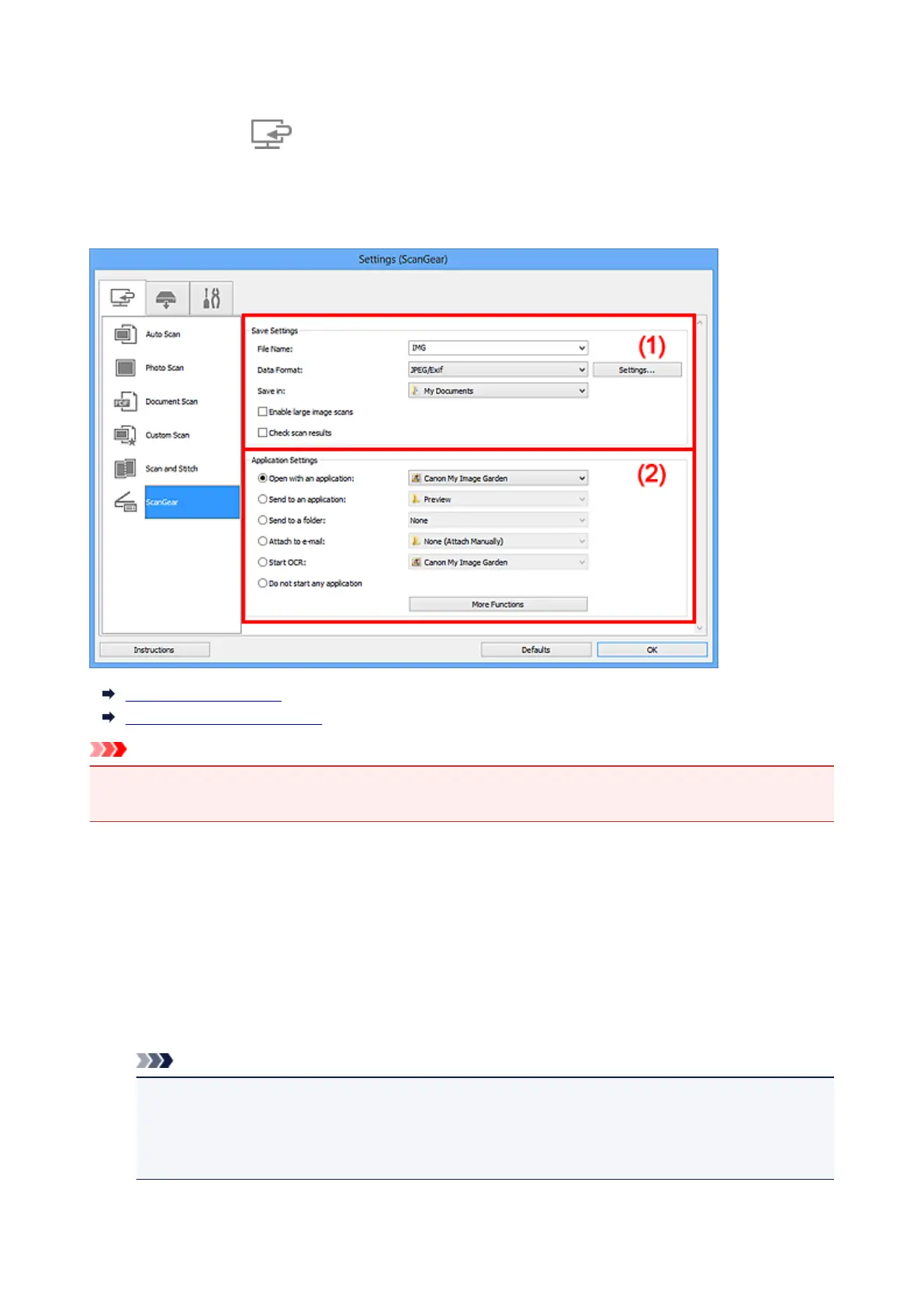 In the Settings (ScanGear) dialog box, you can specify how to save images when scanning items by