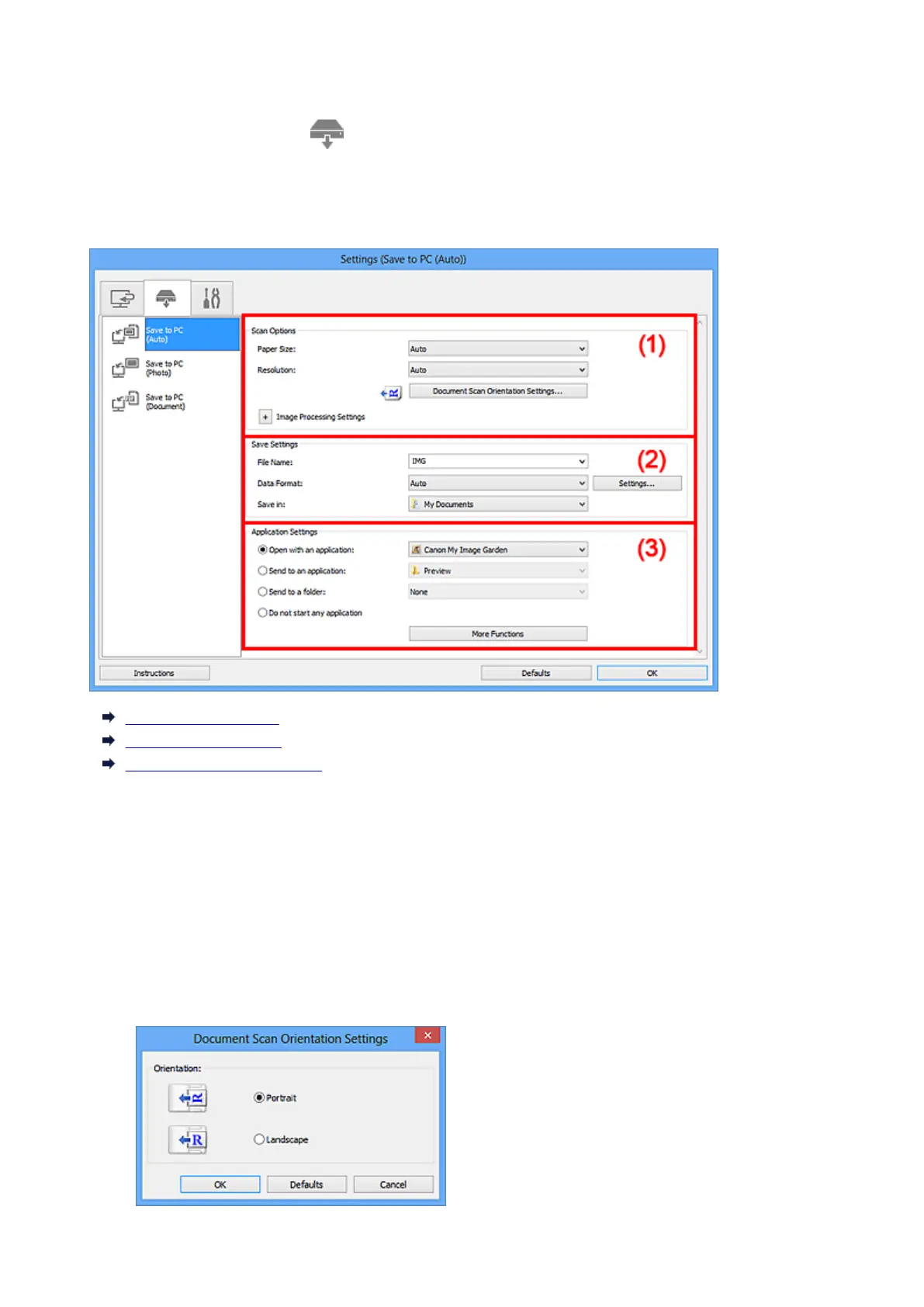 Click Save to PC (Auto) on the (Scanning from the Operation Panel) tab to display the Settings (Save