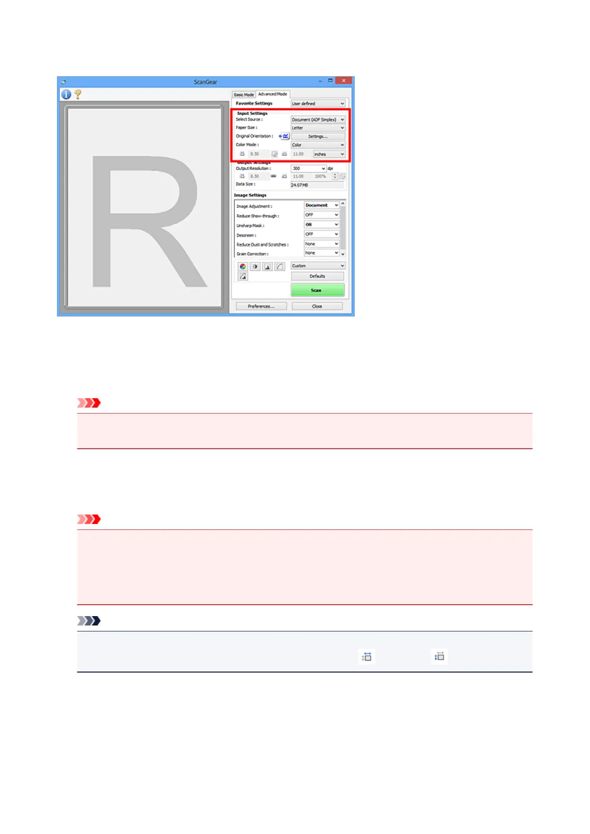 Select the size of the document to be scanned. This setting is available in whole image view only.
