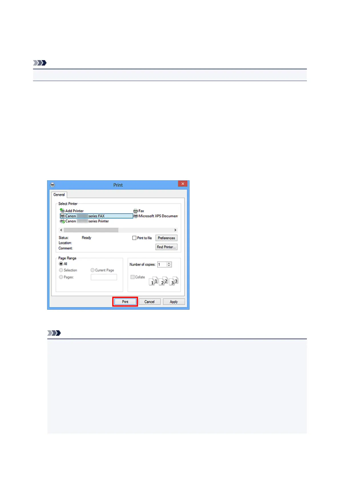 In Select Printer or Name in the Print dialog box, select Canon XXX series FAX (where