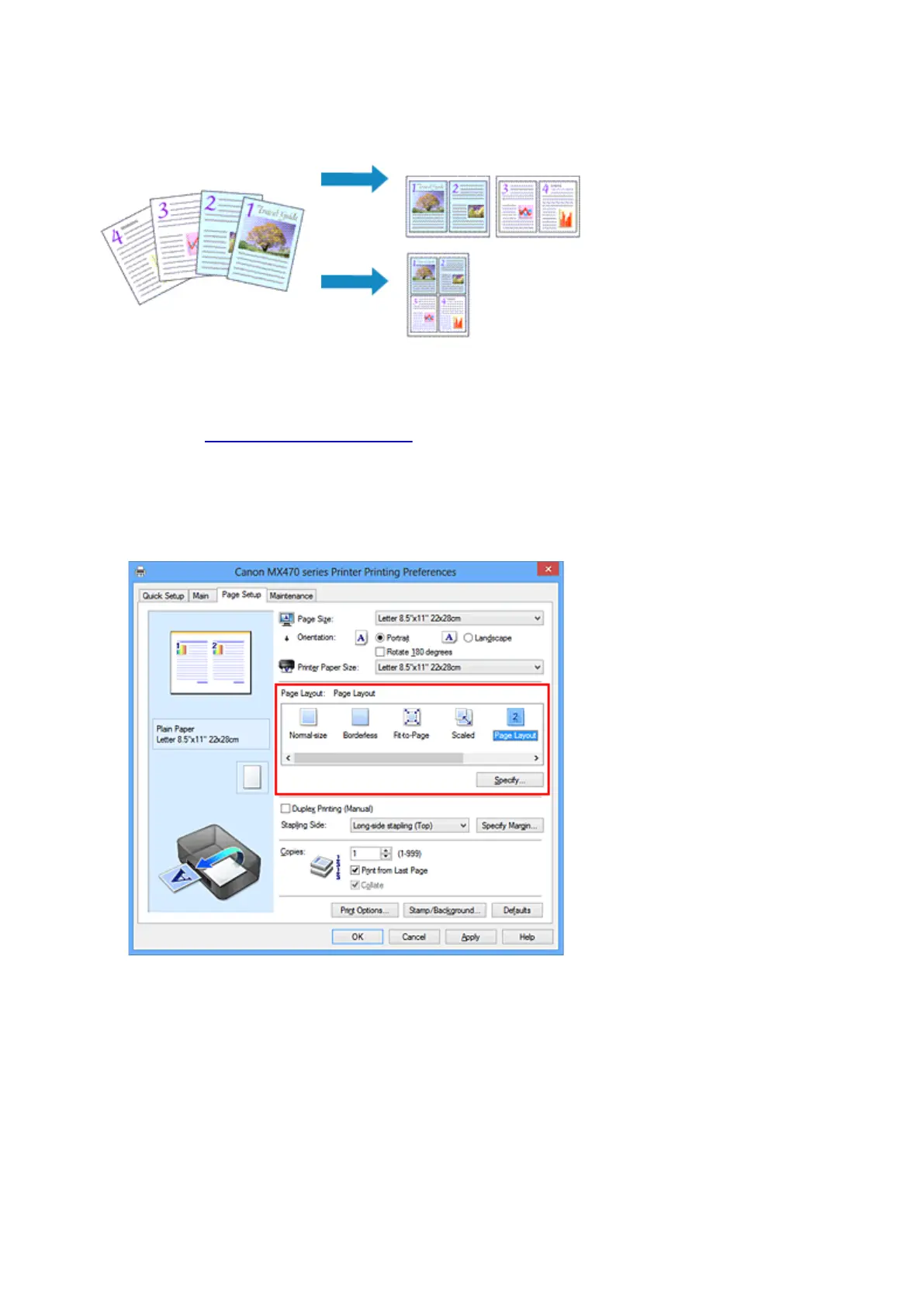 The page layout printing function allows you to print more than one page image on a single sheet of paper.