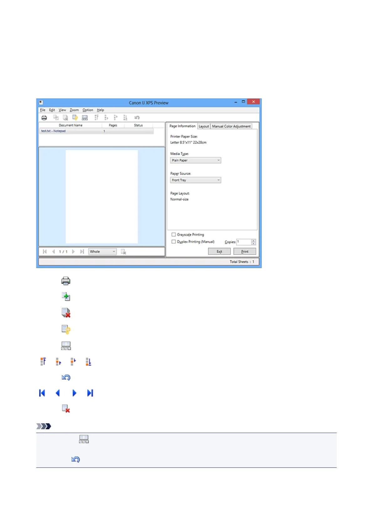 In the Canon IJ XPS preview window, you can edit the print document or retrieve the document print history