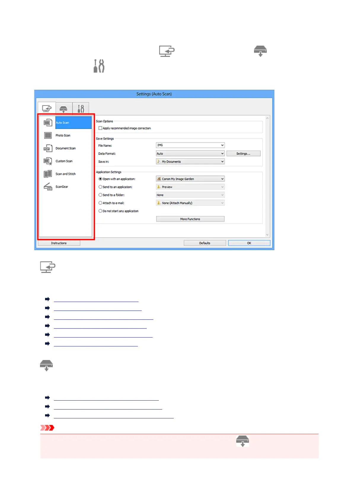 • When the Settings dialog box is displayed from My Image Garden, the (Scanning from the