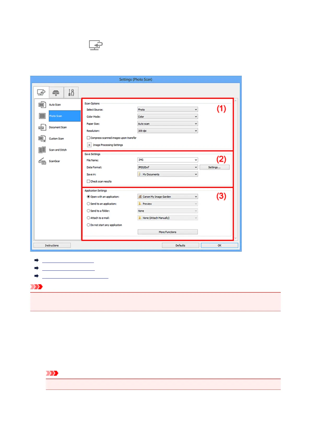 In the Settings (Photo Scan) dialog box, you can make advanced scan settings to scan items as photos.