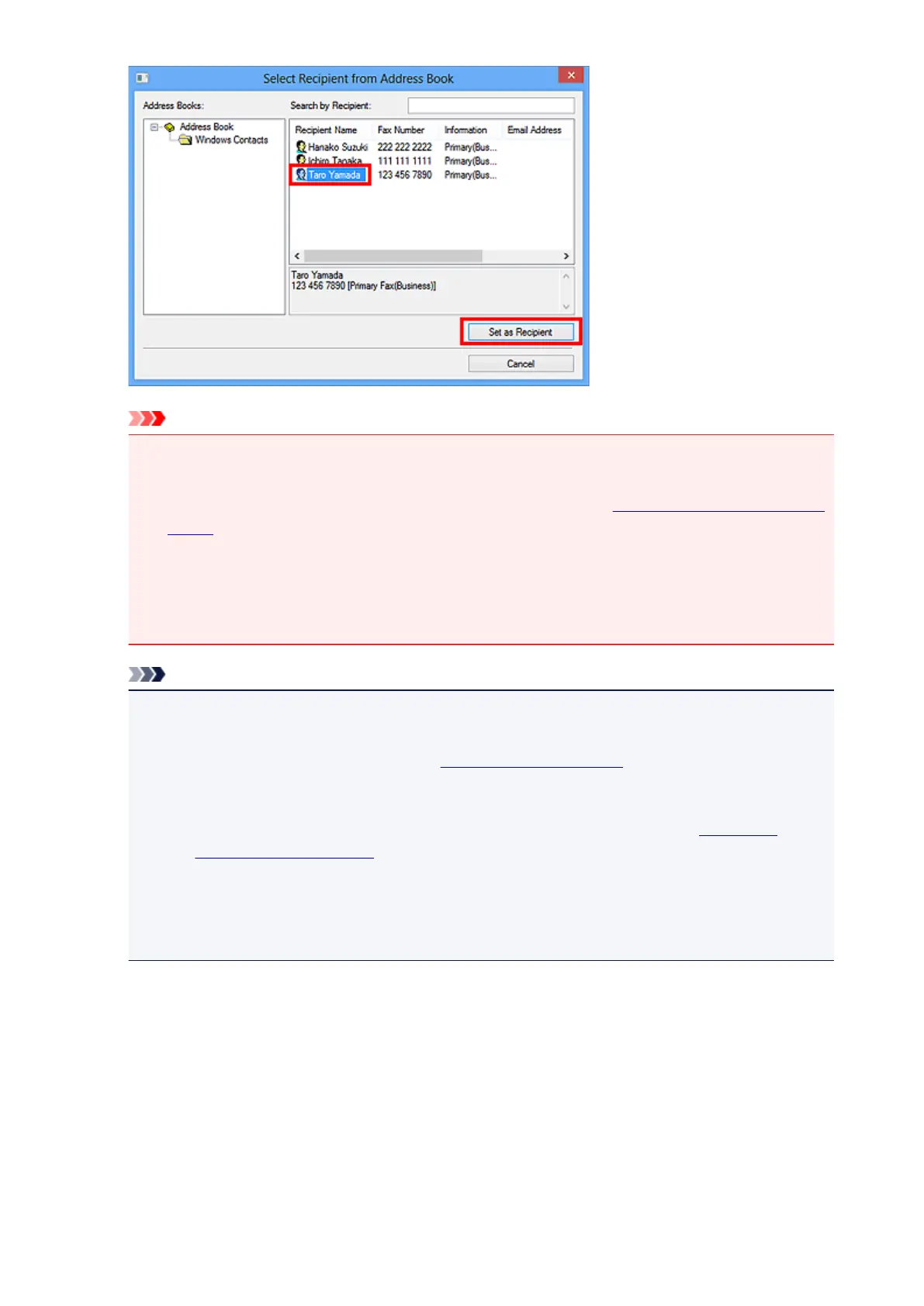 Entry in the Send FAX dialog box and then clicking Set as Recipient.