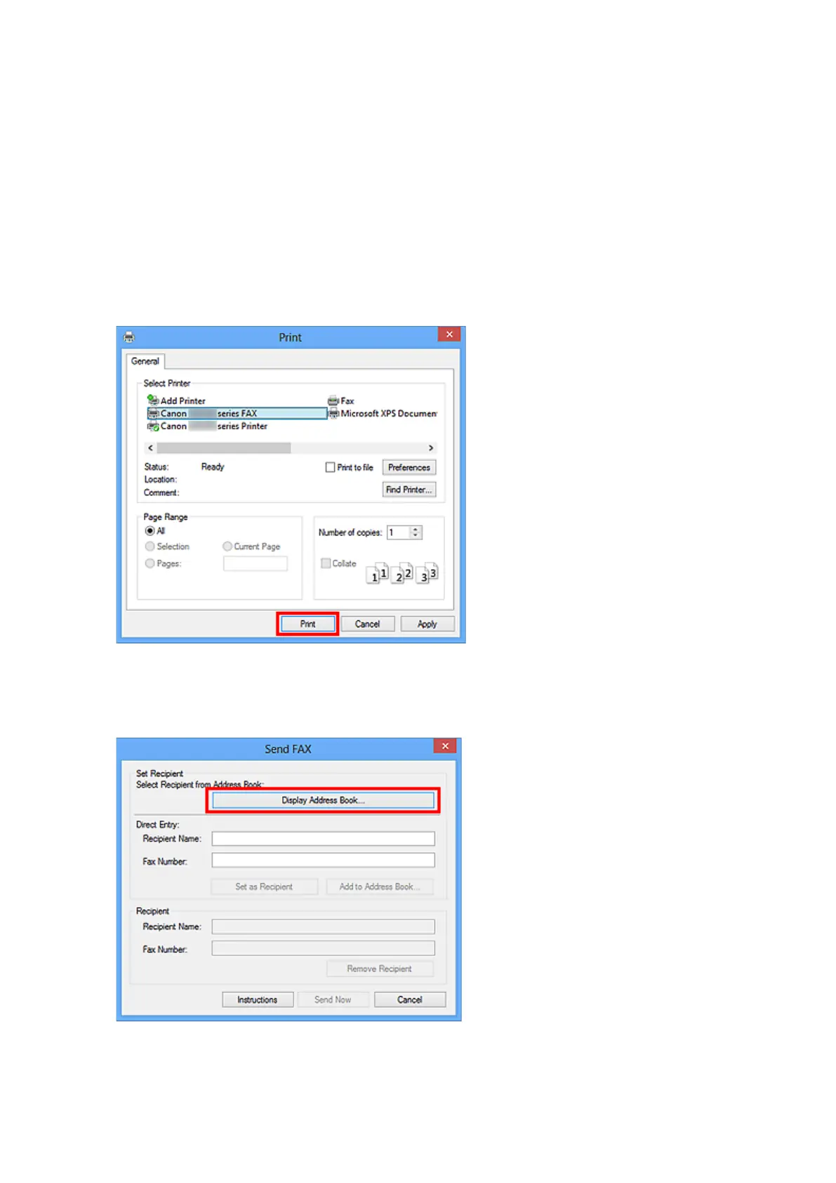 In Select Printer or Name in the Print dialog box, select Canon XXX series FAX (where