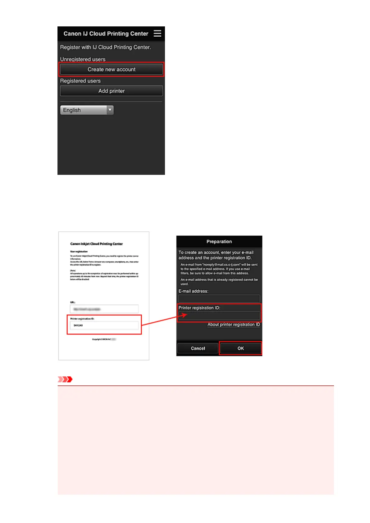 Enter the E-mail address and Printer registration ID of the printer's owner, and then