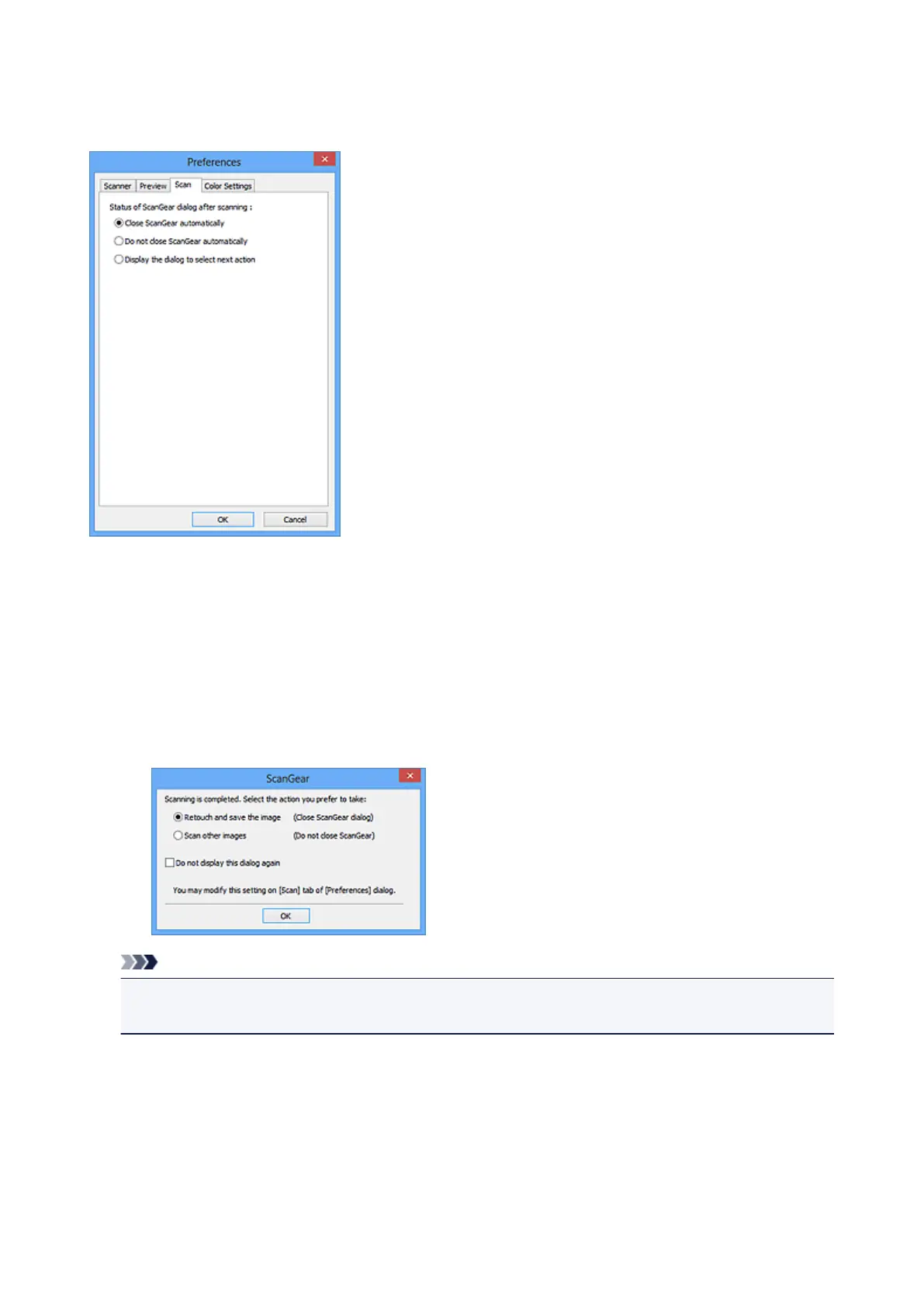 • Even if Do not close ScanGear automatically or Display the dialog to select next action is set,