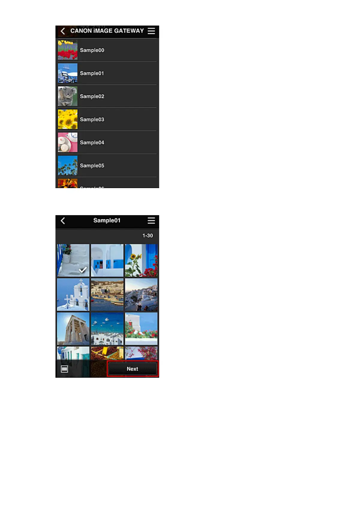 In the displayed image list, select the image that you want to print, and then select Next