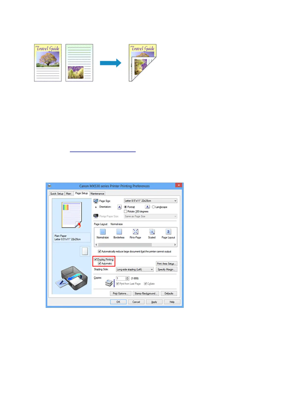 Check the Duplex Printing check box on the Page Setup tab and confirm that Automatic is checked.