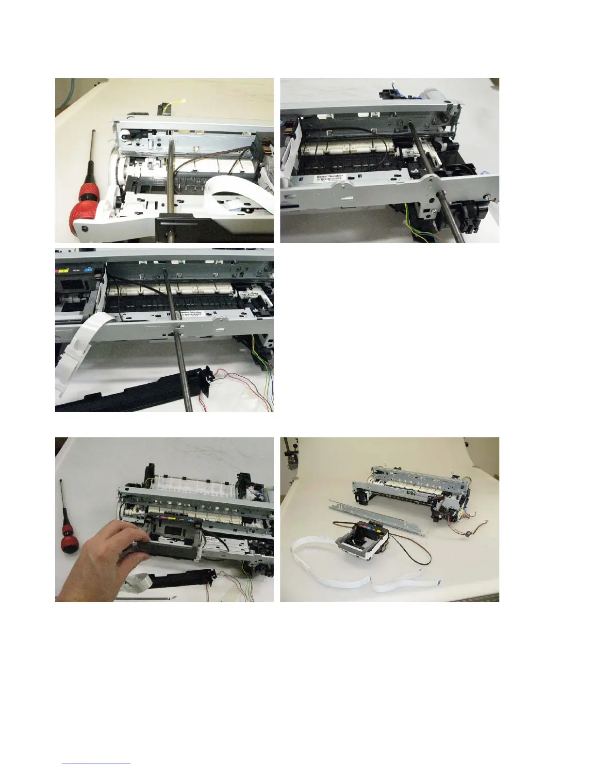 4) Remove 3 screws that fix the carriage rail to the main chassis. Before removing the center screw,