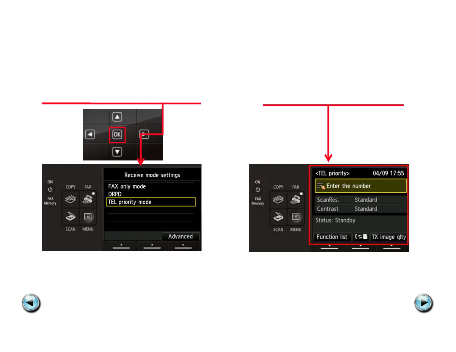 Canon MX922 - Step 17: Confirm TEL priority Mode; Step 18: Return to Fax Standby Screen