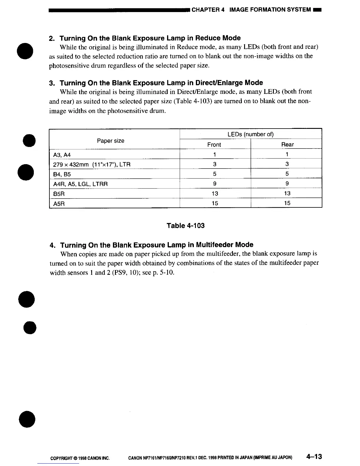 Canon NP7161 - Turning on the Blank Exposure Lamp in Reduce Mode; Turning on the Blank Exposure Lamp in Direct;Enlarge Mode; Turning on the Blank Exposure Lamp in Multifeeder Mode