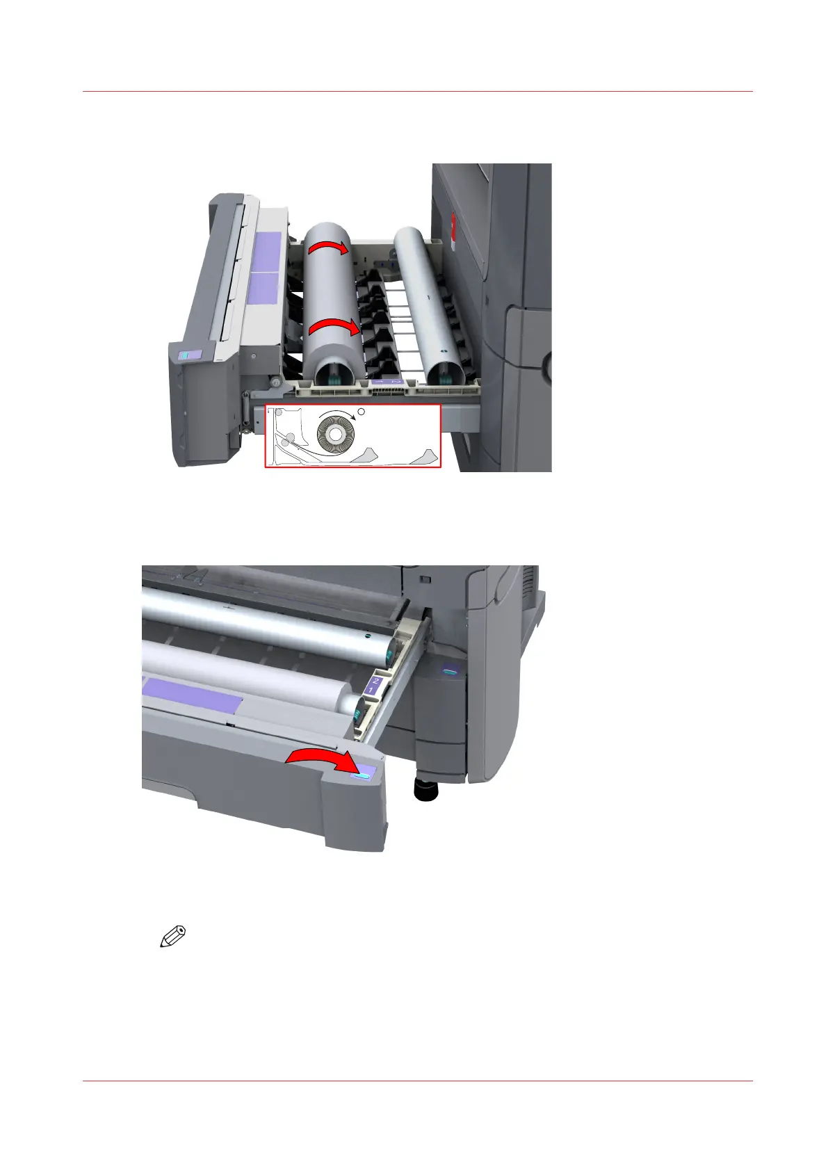 If necessary, press the clean cut button to trim a strip of the new media roll. Press once for a strip