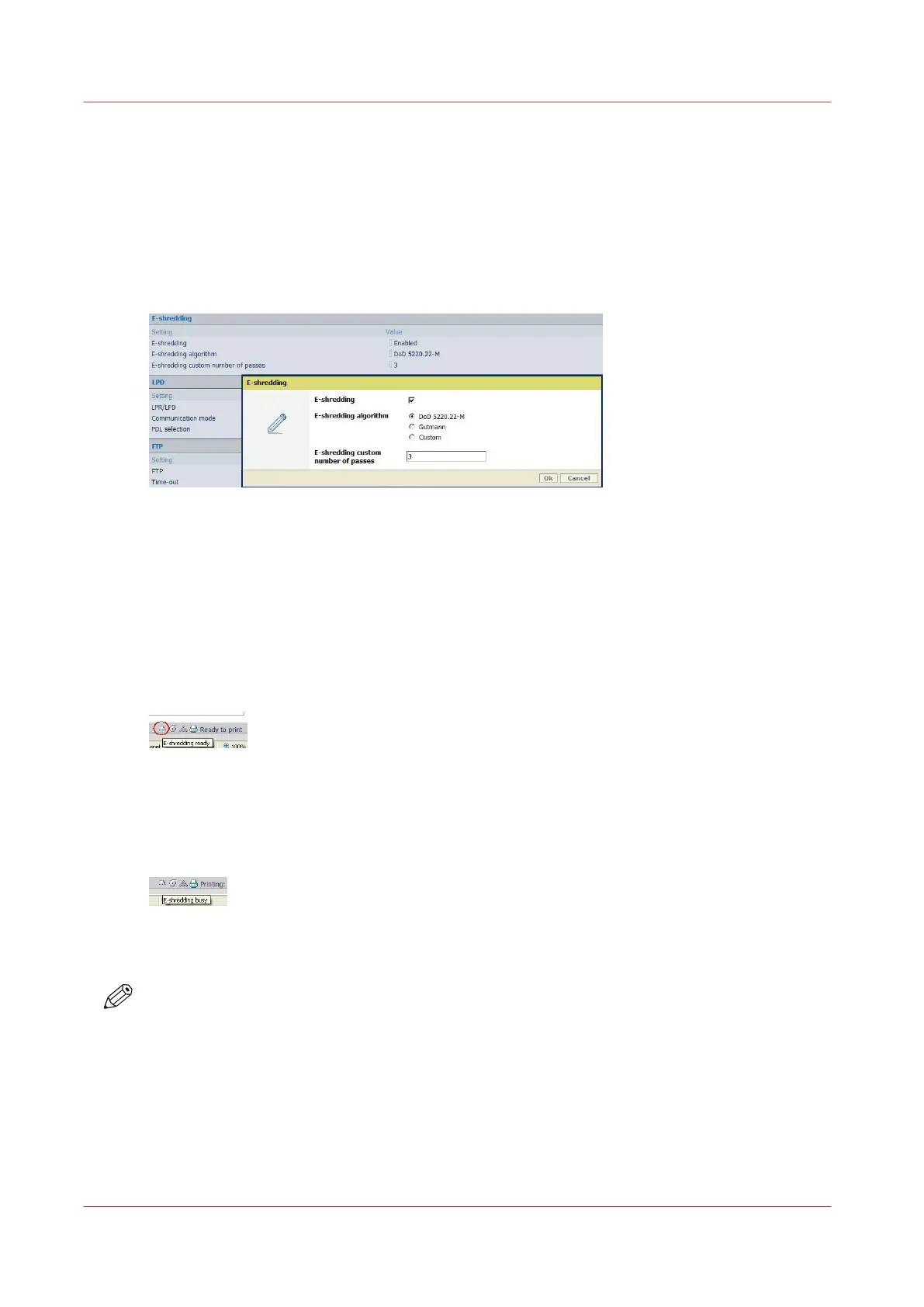 • On the printer user panel, an indication is displayed in the System menu: 'E-shredding
