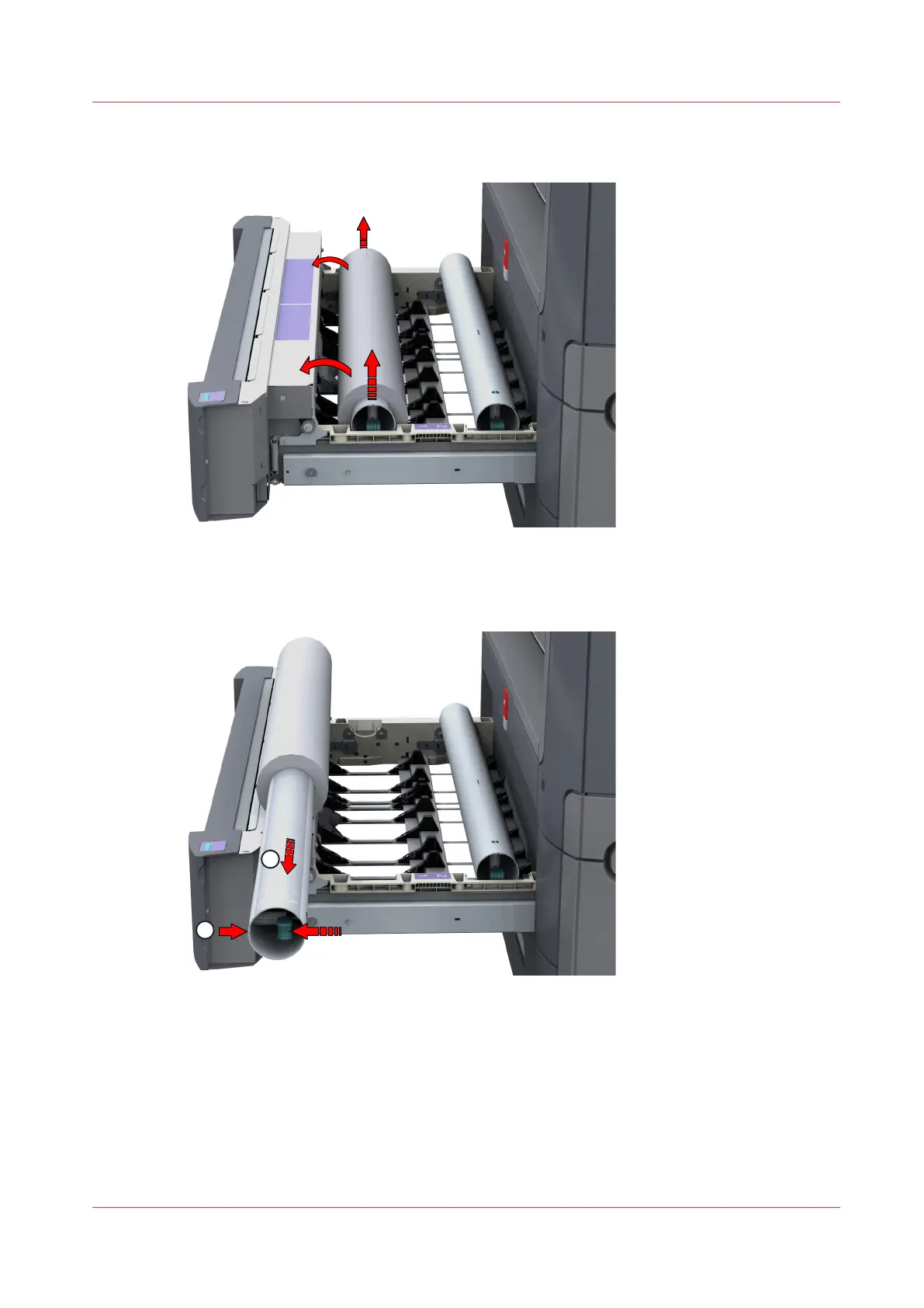 Use both hands (as indicated) to lift the roll holder with the media roll and put it on the roll