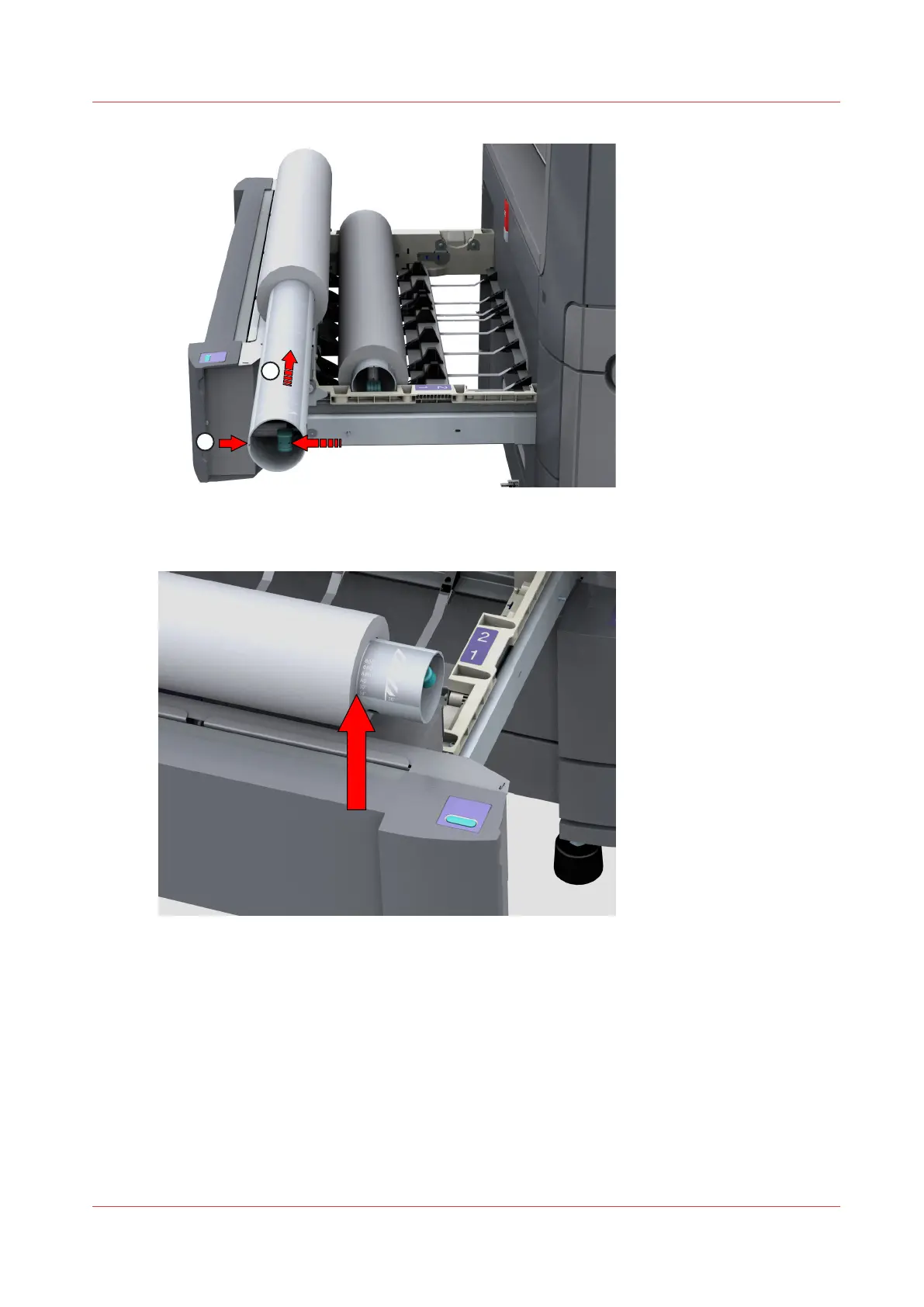 Use both hands (as indicated) to place the media roll in the media drawer.