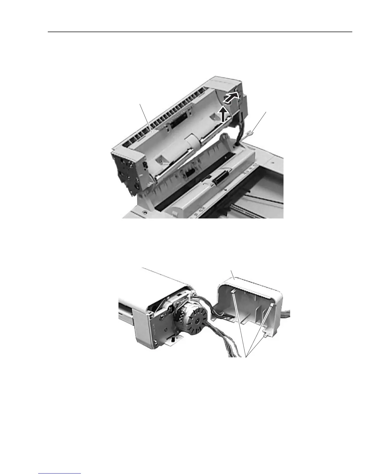 (7) Open the document feed ass’y, and detach the stopper. While lifting up the rear side of