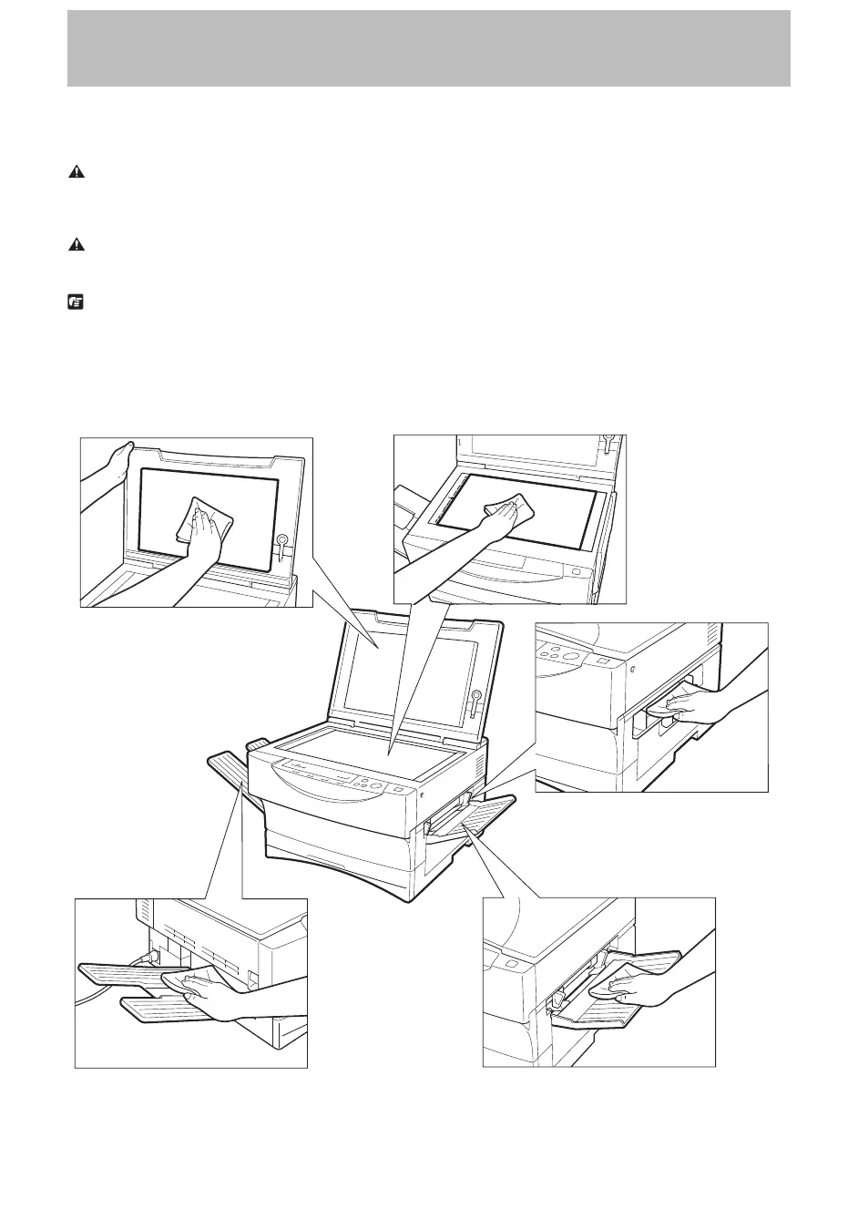 I Before cleaning, be sure to turn the power OFF and unplug the copier.