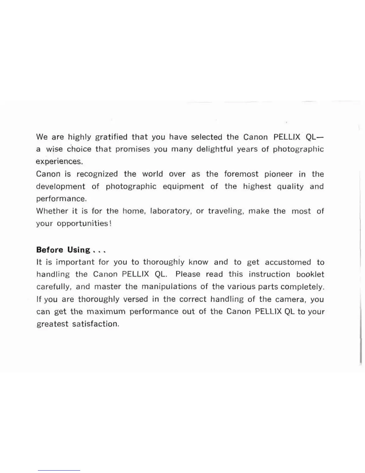 We are highly gratified that you have selected the Canon PELLIX