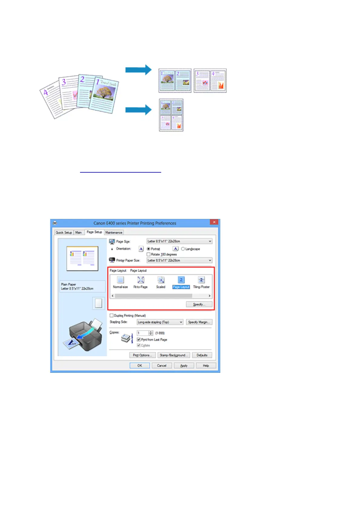 The page layout printing function allows you to print more than one page image on a single sheet of paper.