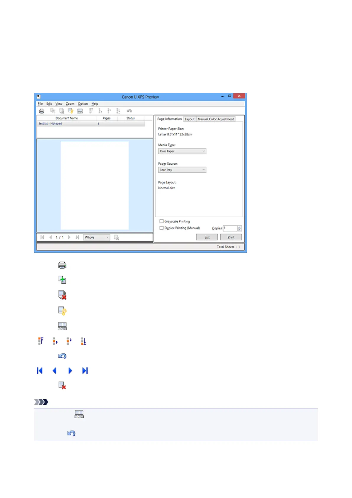 In the Canon IJ XPS preview window, you can edit the print document or retrieve the document print history