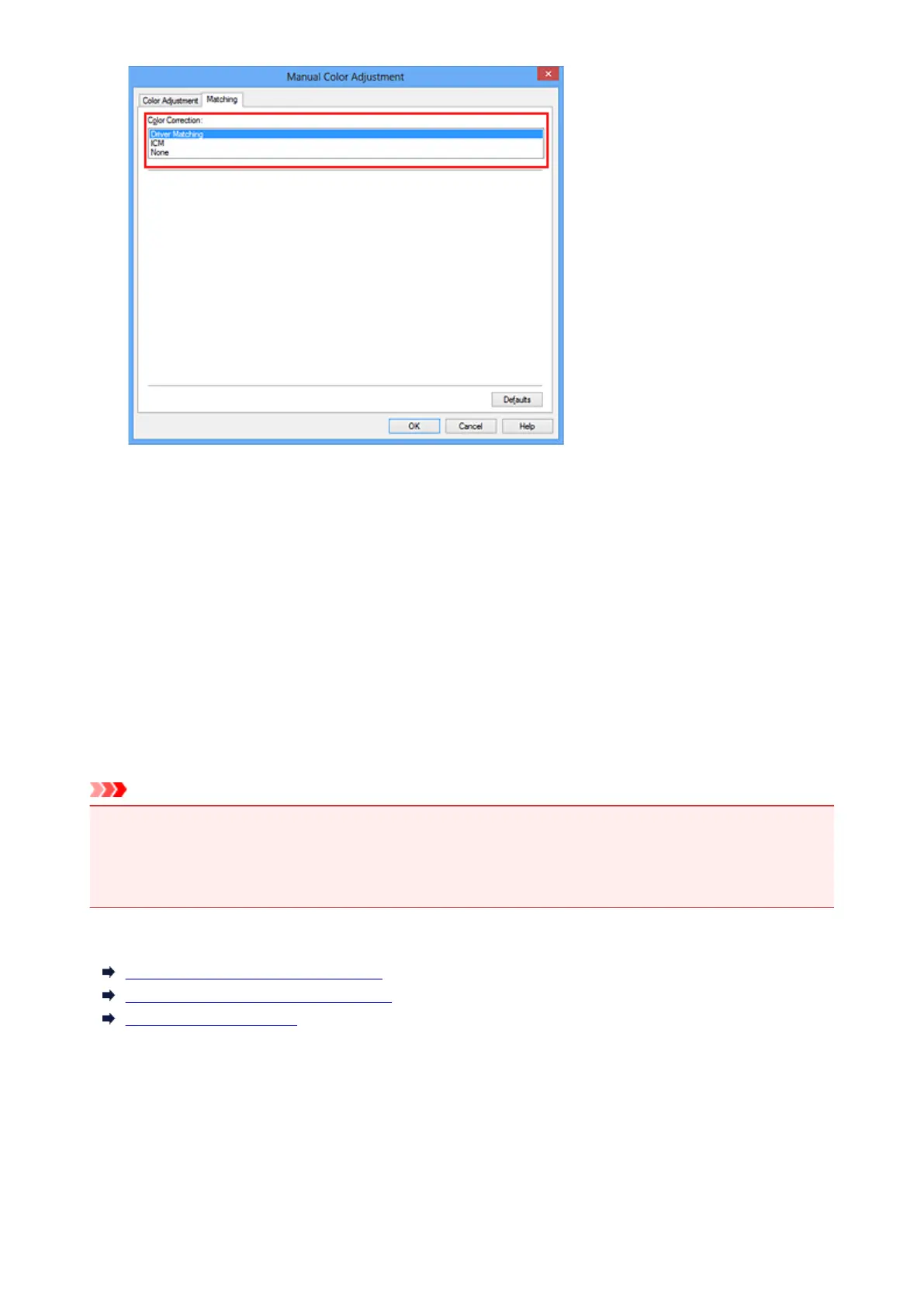 • When ICM is disabled in the application software, ICM is unavailable for Color Correction and the