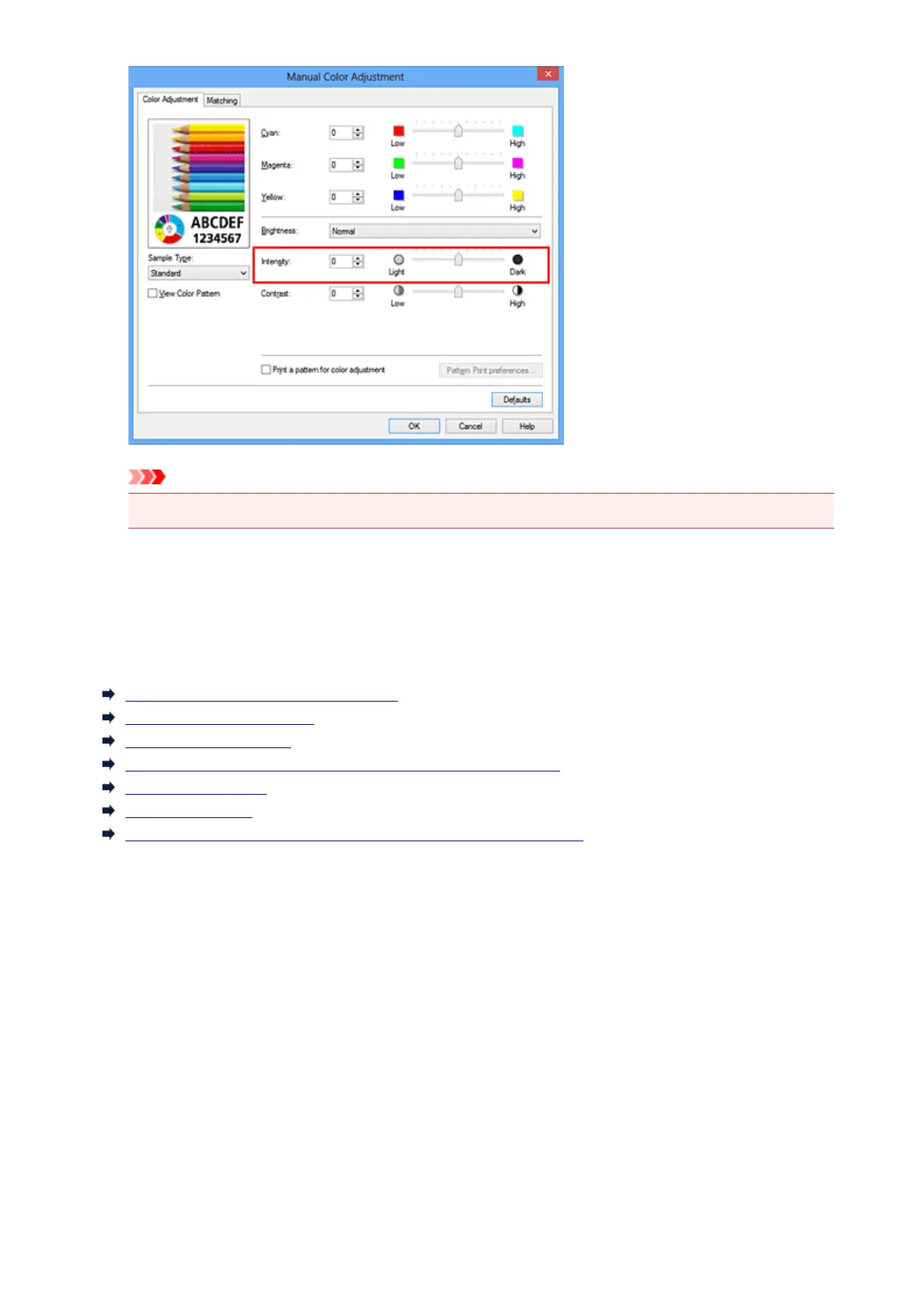 Adjusting Intensity/Contrast Using Sample Patterns (Printer Driver)
