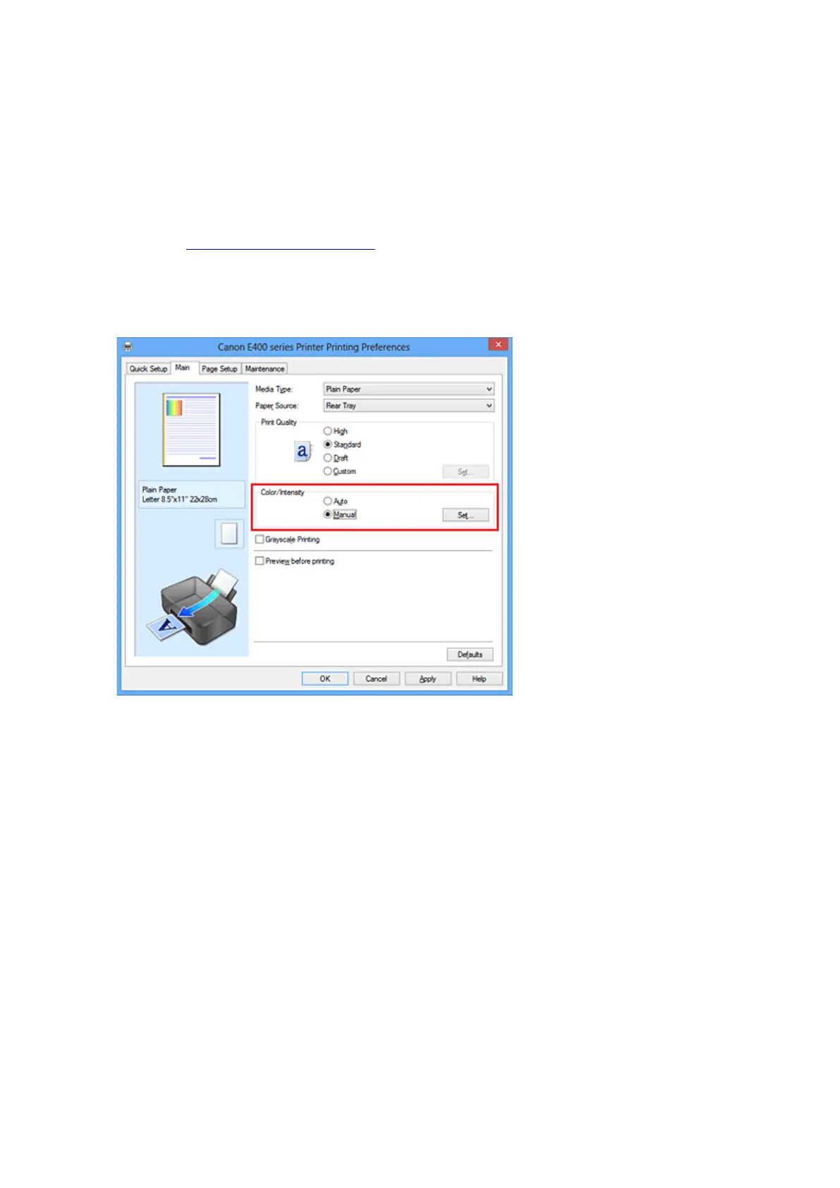 On the Main tab, select Manual for Color/Intensity, and click Set....