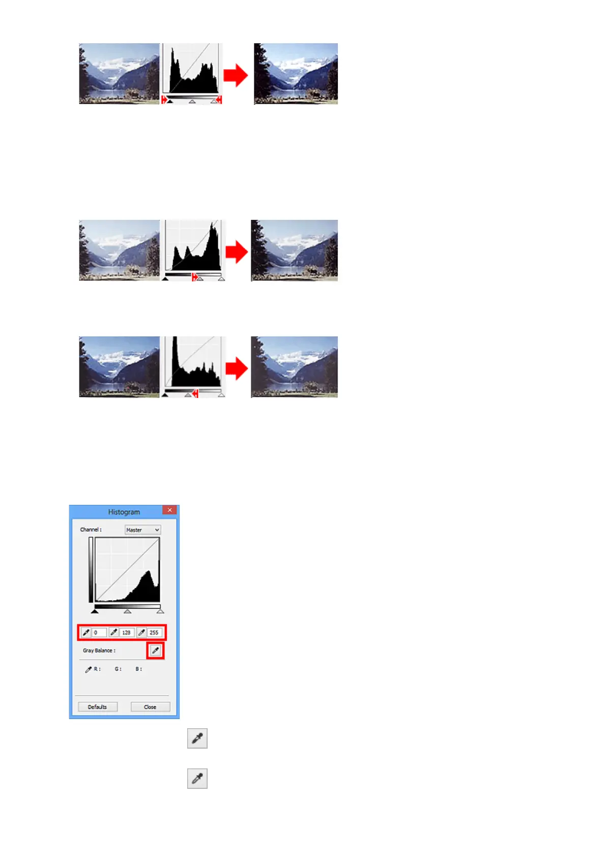 pointer on the preview image changes to a dropper. Click a Dropper displayed below the histogram to