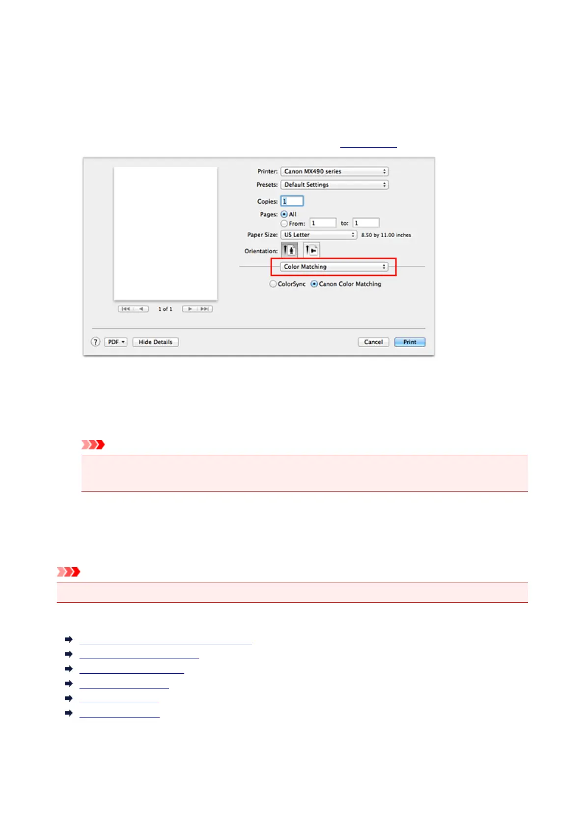 1. Select Color Matching from the pop-up menu of the Print Dialog