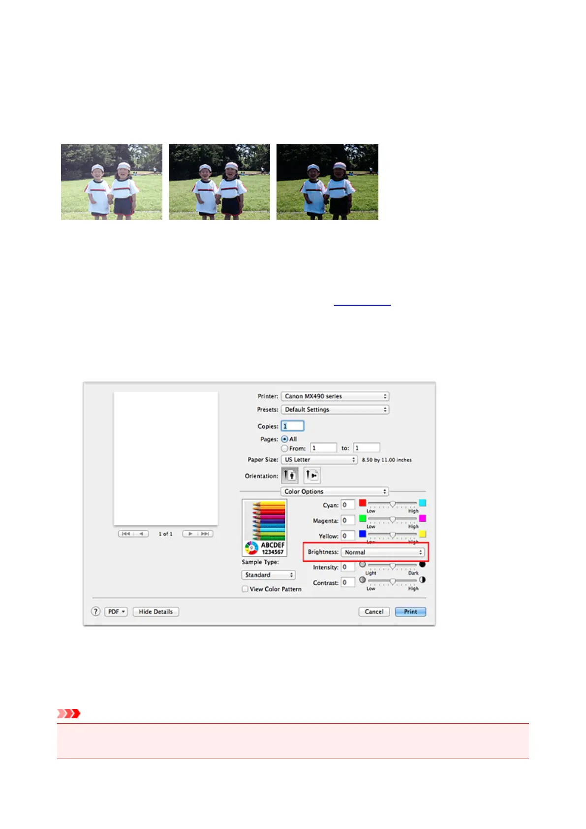 • If you select ColorSync for Color Matching, then the Brightness appears grayed out and is