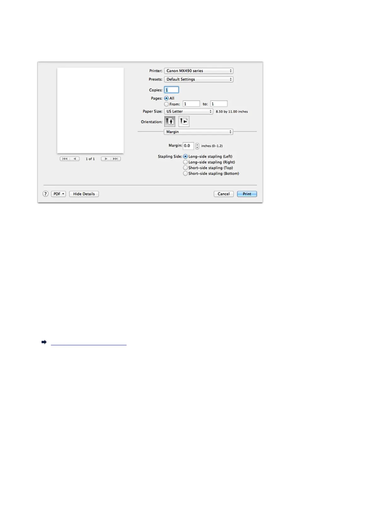 This dialog allows you to set the stapling side and amount of margin for stapling multiple sheets of paper.