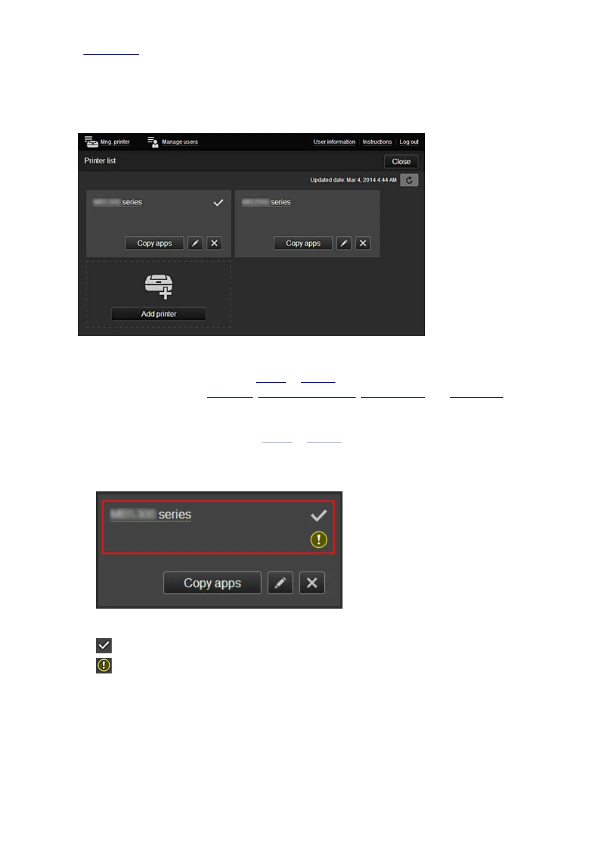 From the Mng. printer screen, you can check* or update* printer information registered to the Canon