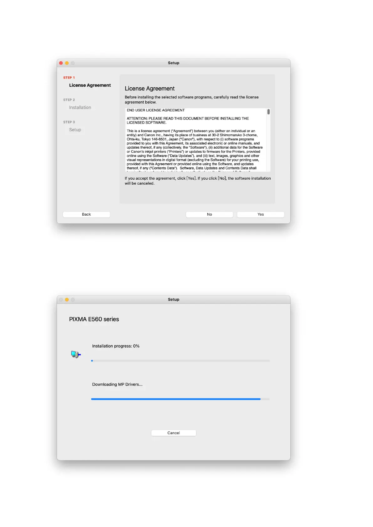 Canon PIXMA E560 - License Agreement and Download Progress; Accept License Agreement; Download MP Drivers