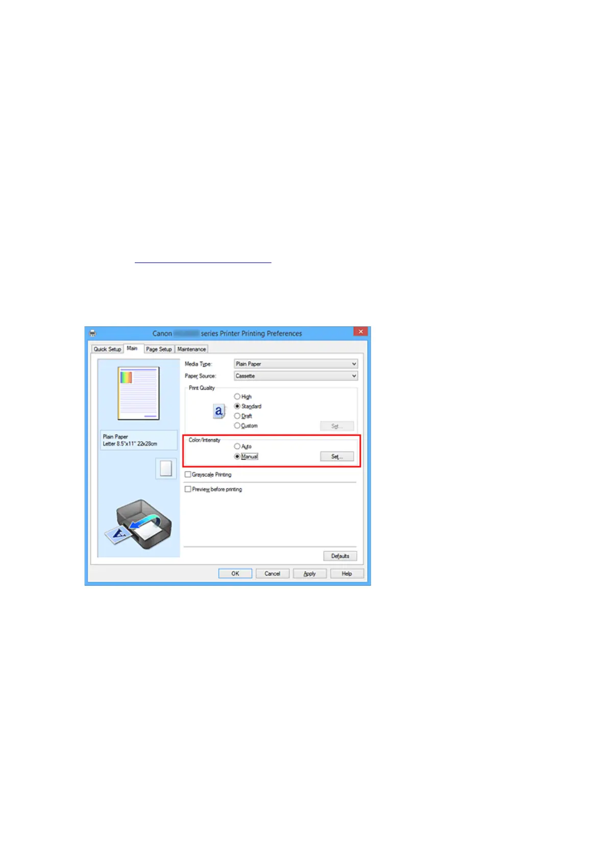 On the Main tab, select Manual for Color/Intensity, and click Set....
