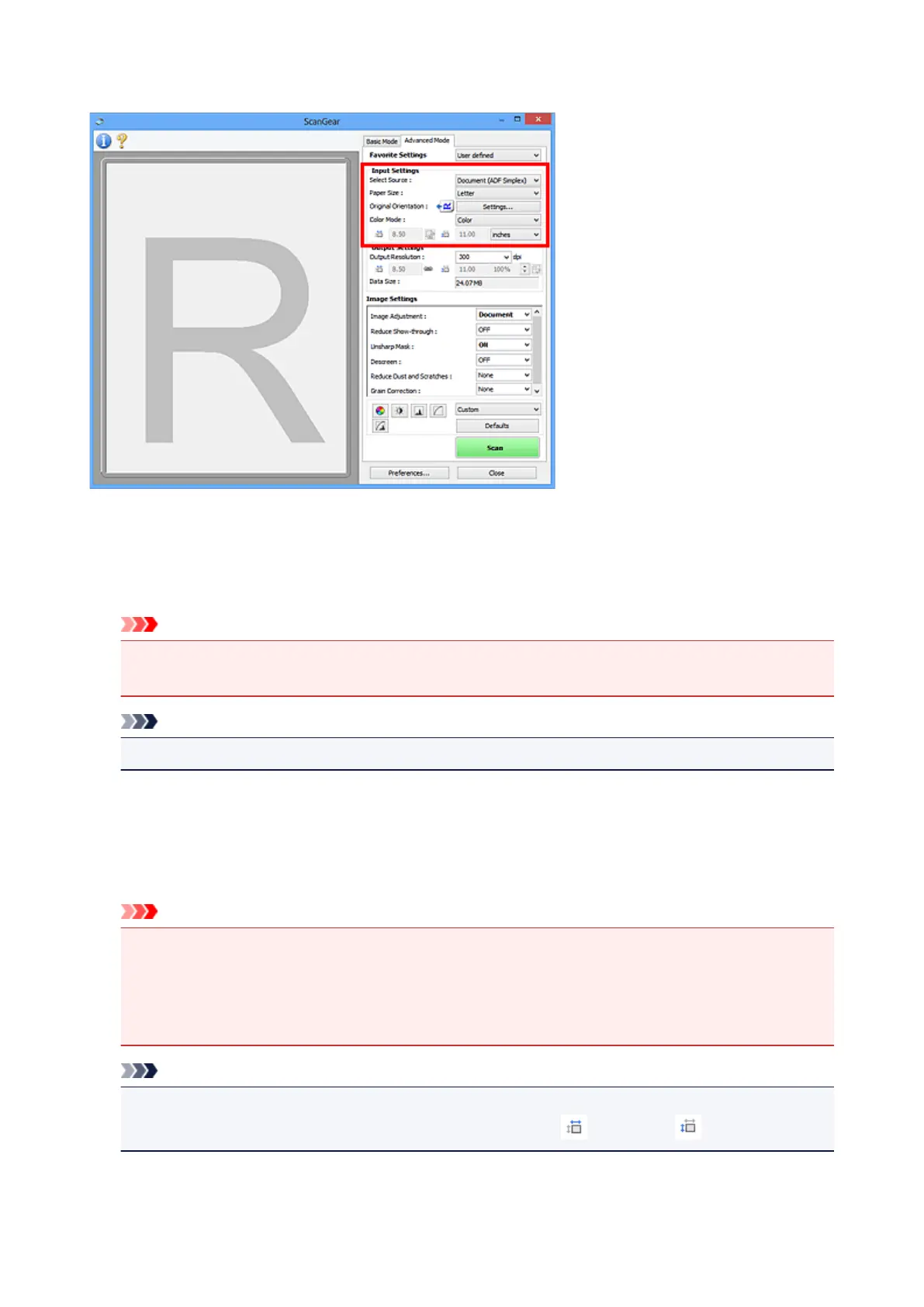 Select the size of the document to be scanned. This setting is available in whole image view only.