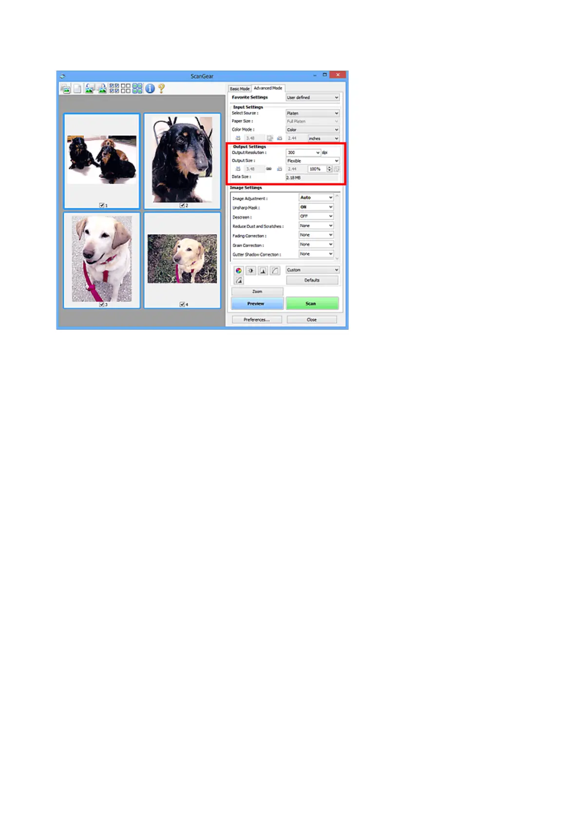 You can specify the output resolution and scale, and adjust the cropping frames (scan areas).