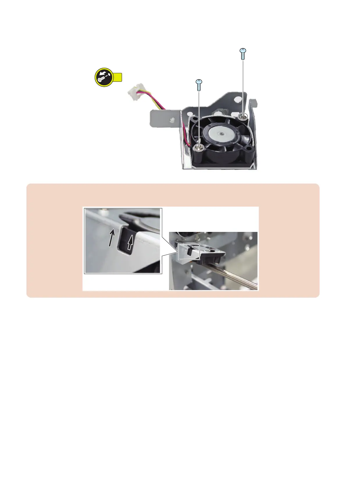 Align the direction of the arrow on the fan and the fixing plate at assembling of the Pickup Release Solenoid Cooling Fan.
