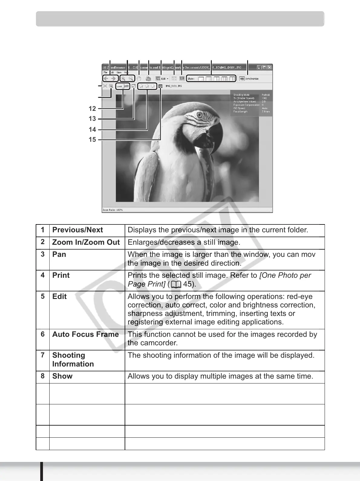 Zoom In/Zoom Out Enlarges/decreases a still image.