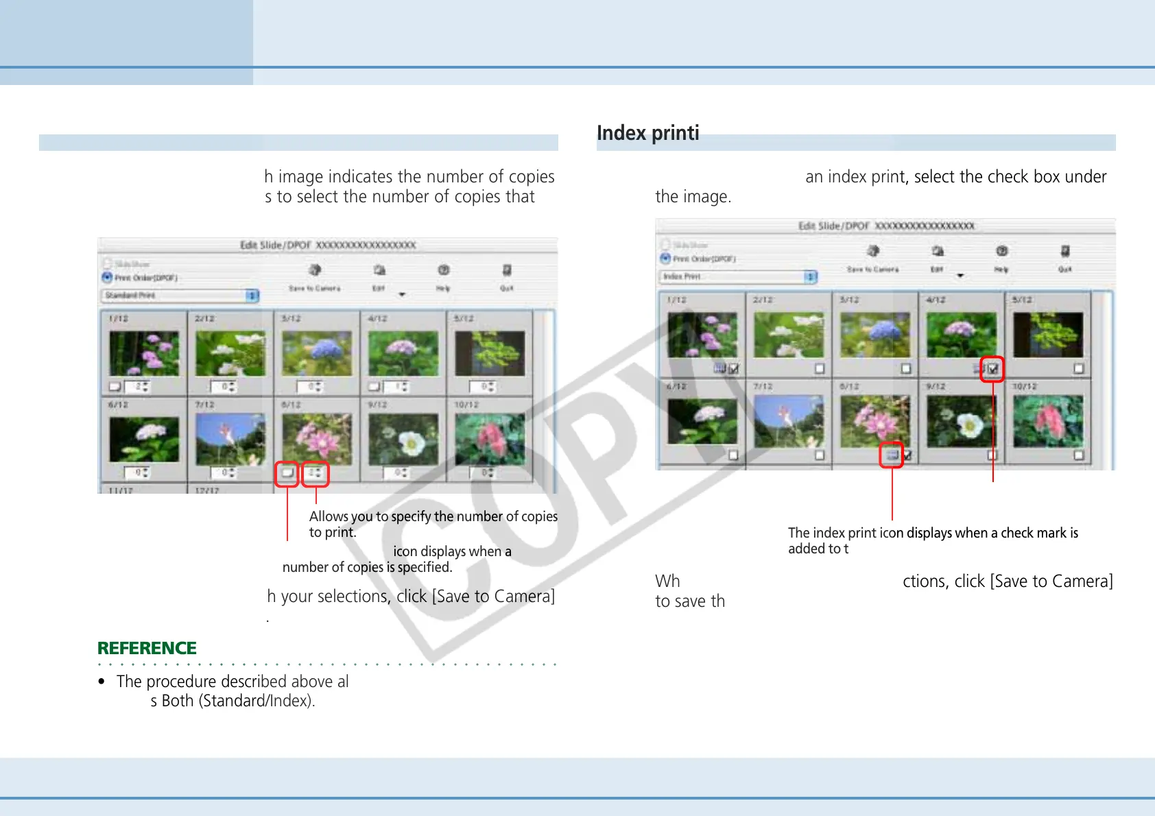 To include images in an index print, select the check box under