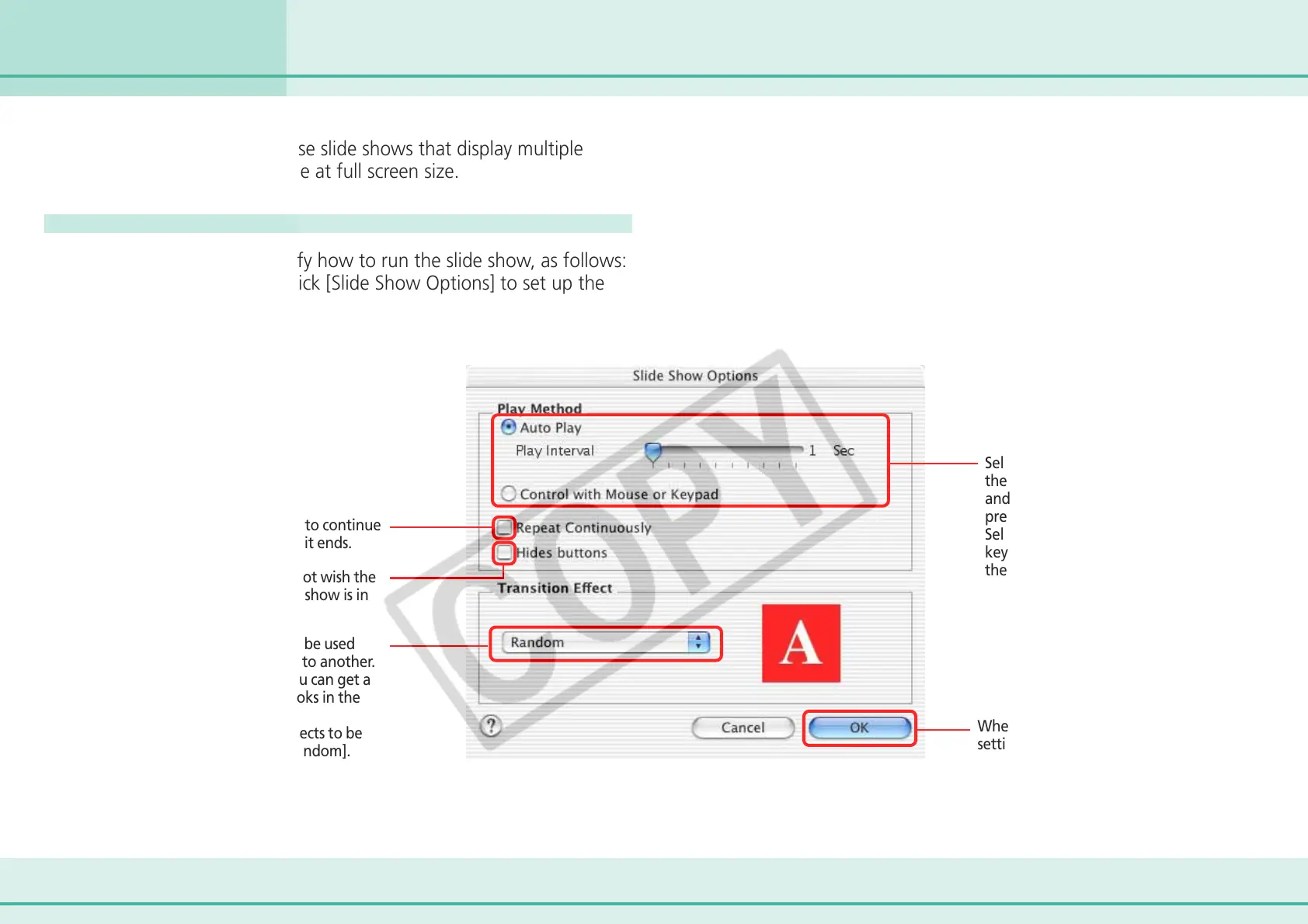 First, you need to specify how to run the slide show, as follows: