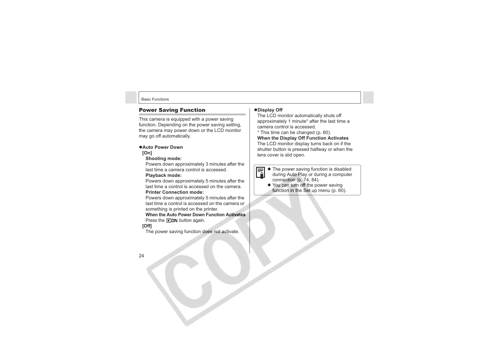 function. Depending on the power saving setting,