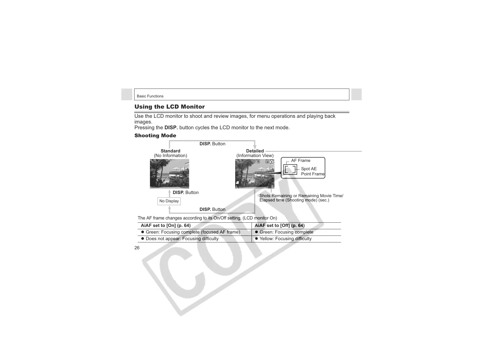 Pressing the DISP. button cycles the LCD monitor to the next mode.