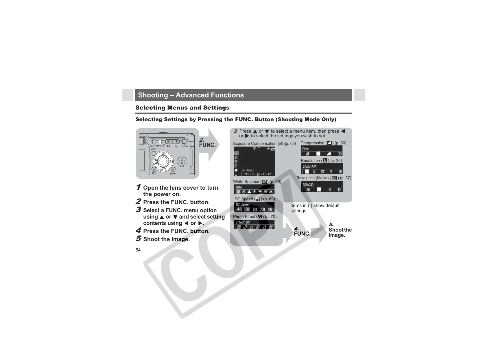 Selecting Settings by Pressing the FUNC. Button (Shooting Mode Only)